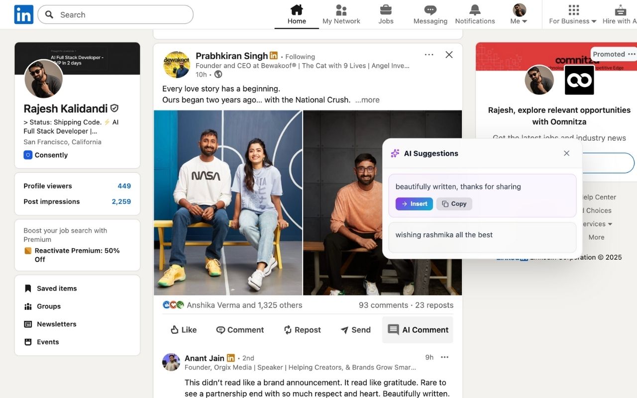 Go to any LinkedIn post. Click 'AI Comment' and watch your engagement soar.